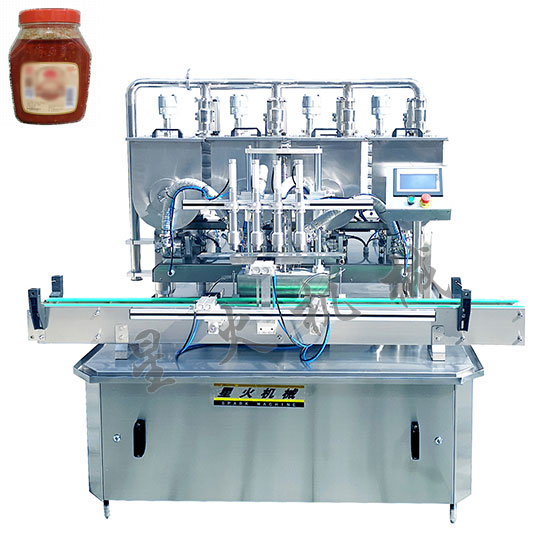 粘稠颗粒酱灌装机是星火转为高粘度颗粒酱料所研发的专用机械设备,它可以覆盖人工操作的所有生产链条,四头活塞式酱料灌装设备通过联动运作,可有序将空瓶输送至灌装工位,避免人工摆瓶的繁琐生产工序,粘稠颗粒酱灌装机采用软件控制系统,配合人机界面的HMI操作,能够在无人辅助的状态下完成全部的生产工序。