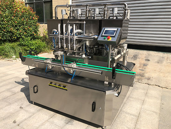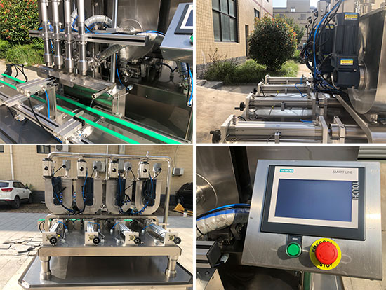 操作原理: 粘稠颗粒酱灌装机采用气缸驱动活塞泵的方式,配合特质加大转阀,能够执行对粘稠酱料的强力推送灌装效果,酱料储存在四个不同的搅拌料斗当中,可以防止油水分离,避免导致颗粒沉淀,四头活塞式酱料灌装设备在经过参数规格的设定后,启动设备后,横推装置将粘稠颗粒酱推送至四个灌装头下方,这种操作模式可缩短输送路径,然后在通过容积定量方式将精确体积的酱料压入瓶中,真空回吸系统在灌装结束后,双重防滴漏快速执行回吸动作,防止粘稠酱料滴落污染瓶口。
